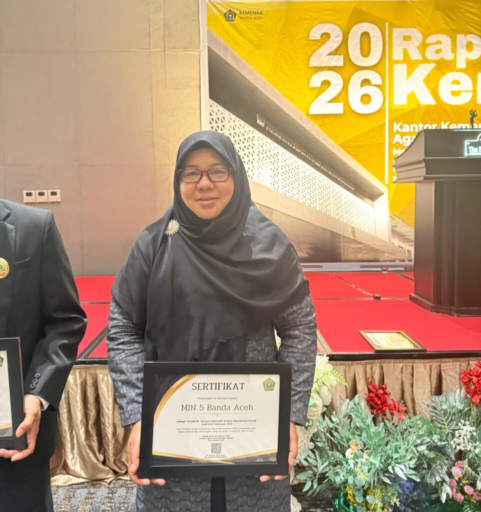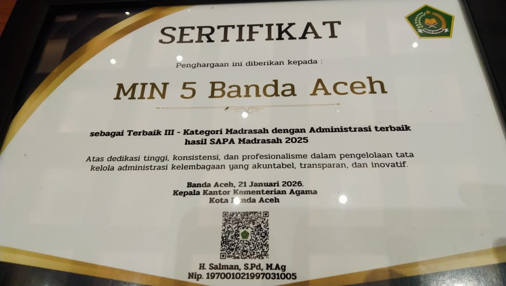Banda Aceh-Madrasah Ibtidaiyah Negeri 5 Banda Aceh menorehkan prestasi membanggakan dengan meraih Piagam Penghargaan Terbaik 3 Kategori Madrasah dengan Administrasi Terbaik pada SAPA Madrasah 2025. Penghargaan tersebut diterima pada Rabu, 21 Januari 2026 disela kegiatan Rapat Kerja (RAKER) Tahun 2026 Kantor Kementerian Agama Kota Banda Aceh di Ballroom The Pade Hotel.