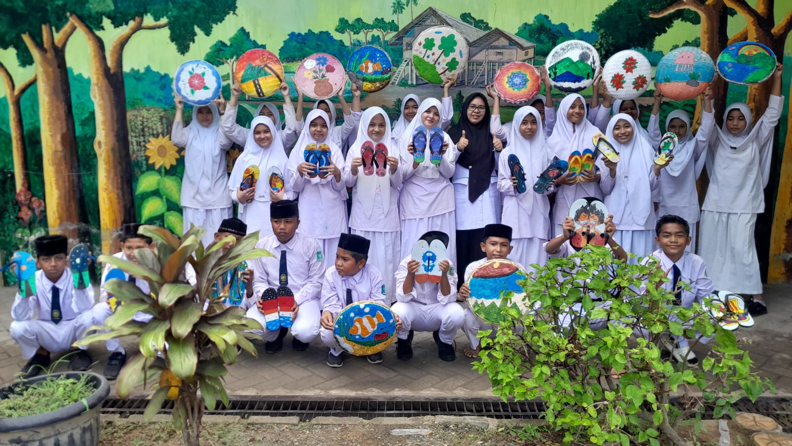 Berbagai gambar menarik muncul dari tangan-tangan kreatif siswa, sebut saja lukisan tema tata surya, lukisan abstrak, tema alam, ikan, dan lainnya. Penggunaan cat air pada media bambu (tampah) dan karet (sandal) memberikan tantangan tersendiri bagi siswa dalam memadukan warna agar terlihat tajam dan indah.